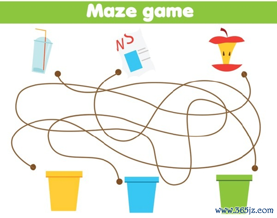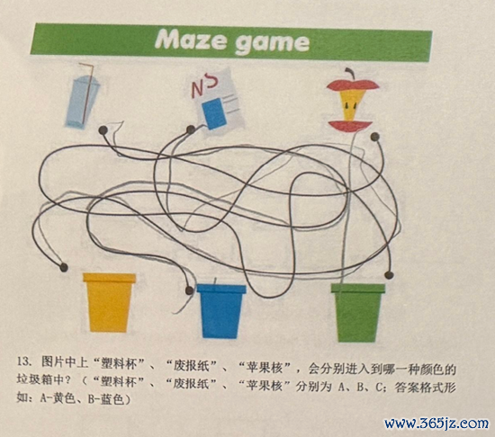三件物品沿着线分别连到哪个颜色垃圾桶?