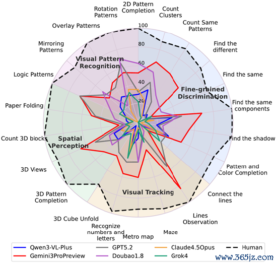 · 评测结果显示人类与模型差距悬殊,人类基线准确率达94.1%;闭源最强Gemini3-Pro-Preview为49.7%,其后GPT-5.2为34.8%、Doubao-1.8为30.2%;开源最强Qwen3VL-235B-Thinking为22.2%。