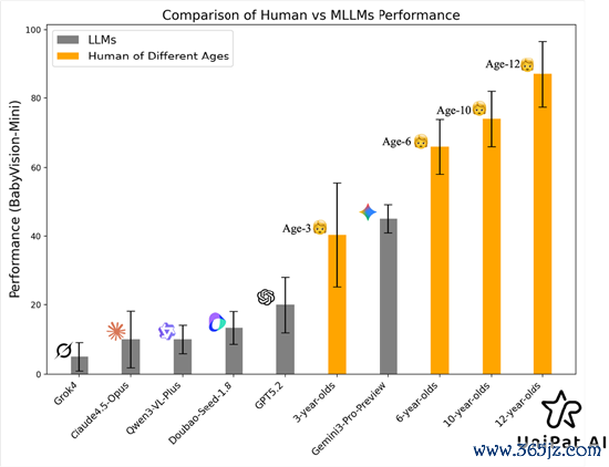 BabyVision 先做了一项非常直接的对比实验:把20道视觉中心任务(vision-centric)作为BabyVision-Mini交给不同年龄段孩子(3/6/10/12岁)和当下顶尖多模态模型来做。